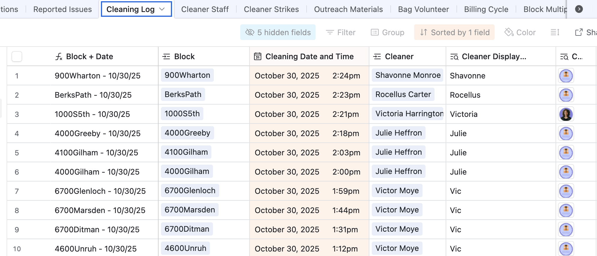 Airtable Cleaning Log table: photo records linked to block records and assigned cleaner
