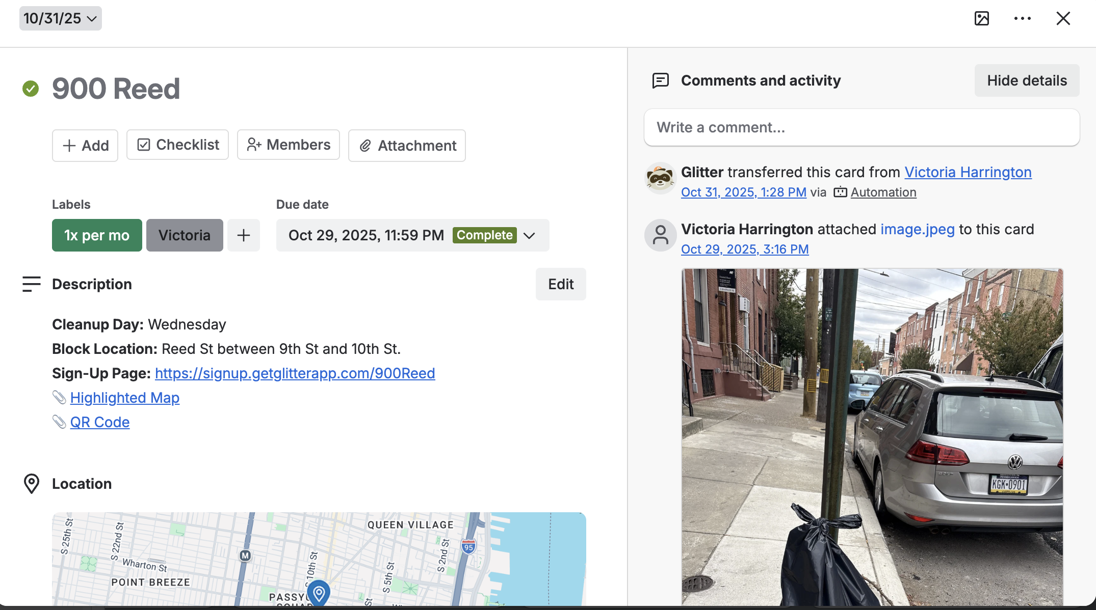 Cleaner submits photos to a block-specific Trello card upon cleanup completion